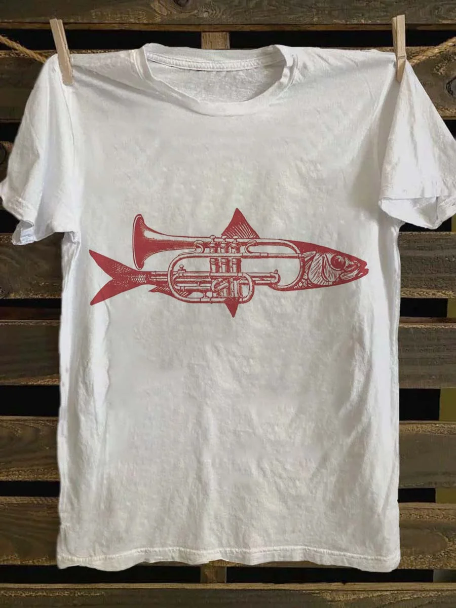 Funny Fish Instrument Print Casual Short Sleeve T-Shirt