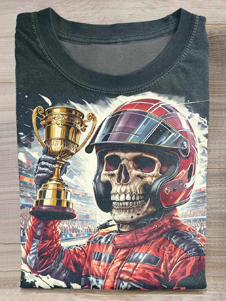 Retro Skull Racing Driver Print Casual Loose T-Shirt