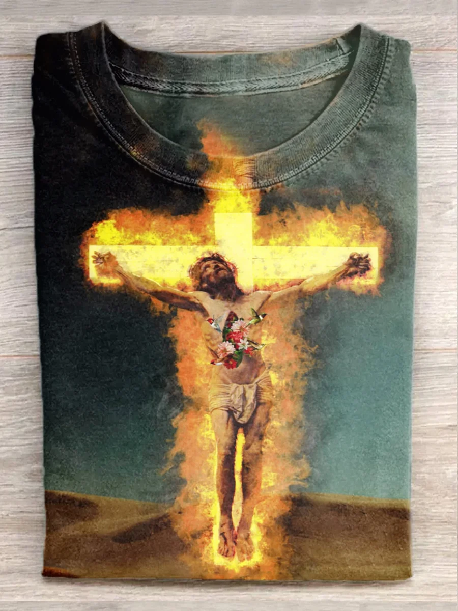 Vintage Jesus Cross Illustration Printed Casual Loose T-shirt