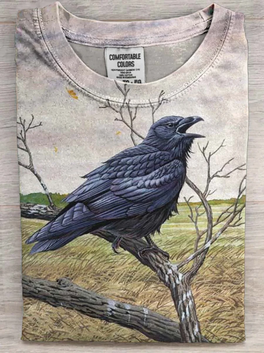 Vintage Raven Print Casual Short Sleeve T-Shirt